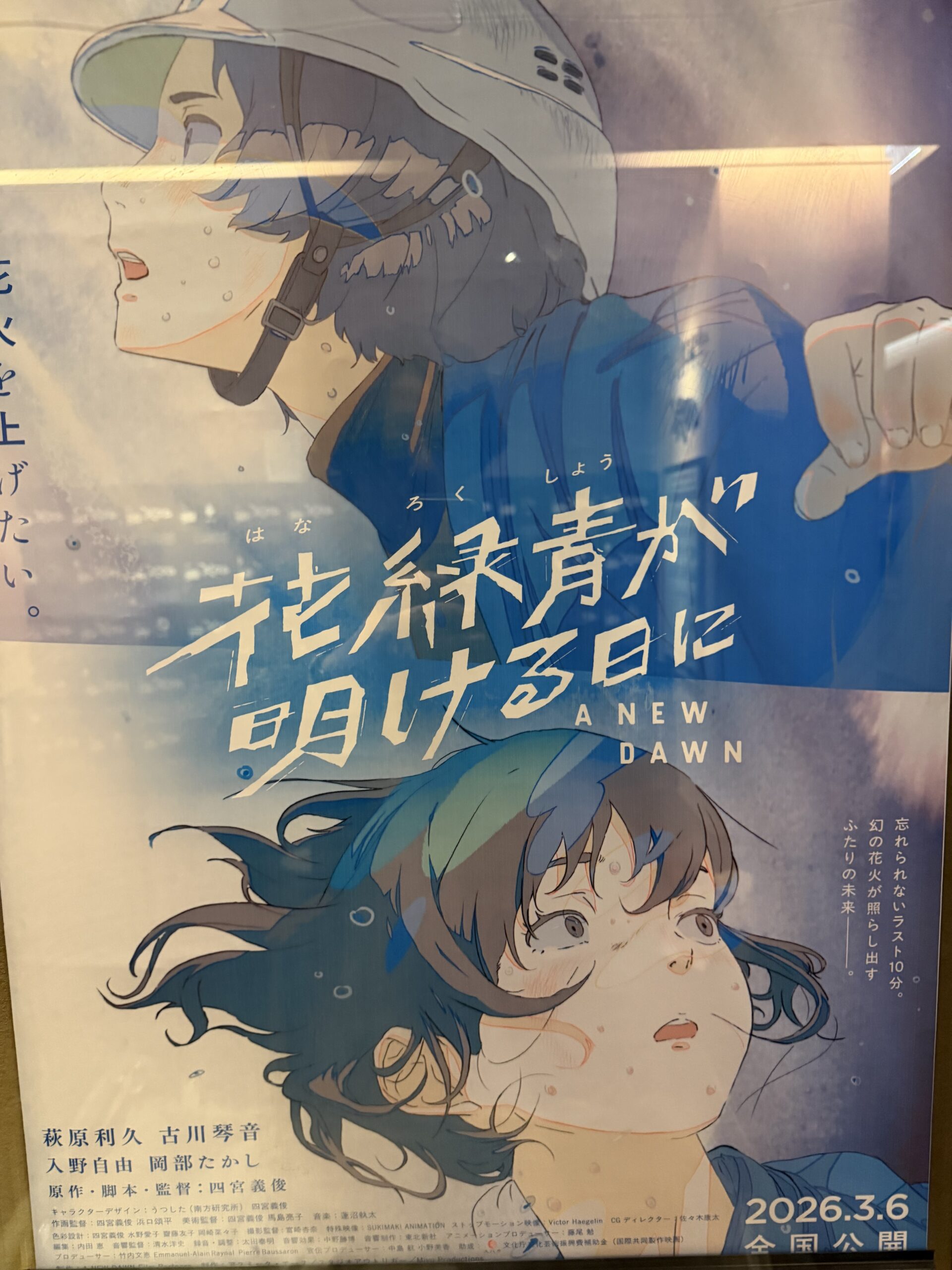 今回は、花緑青が明ける日にを見てきたので、レビューをします。まず流石に君の名はとかに参加していた日本画家の人が監督らしいので背景はとても綺麗でかつ全体的に色使いが特徴があってとても綺麗な絵作りになっていてそこはよかった、ストーリーについては、最初の方で時間が飛び飛びになったりして内容がなんとなく把握しづらく、その辺りがちょっと難ありかなぁと思ったのと、全体的に少し説明が足りない気がする作りになっていてそこはマイナスポイントかなぁ、あとフランスのスタジオが手伝っている影響なのか途中ヘンテコな演出が入っているのがちょっと気になった、お話は花火師の青春モノの映画なのでなかなかキラキラしたり、苦悩したりそういう内容の映画だった、若い花火師のお話というのはなかなかなかったと思うのでそこは、よかったのかも